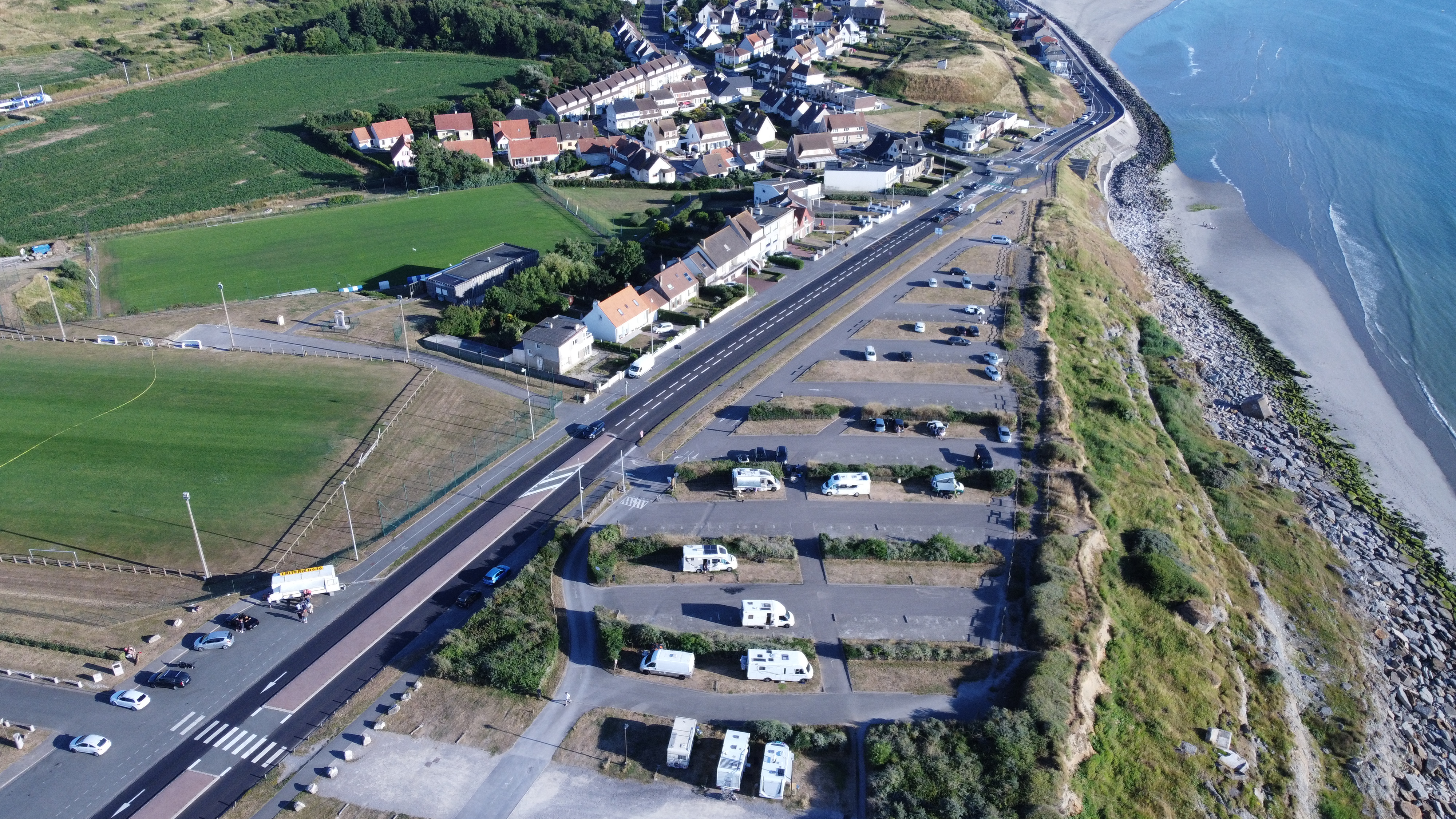 The aire is located between houses and a mussel/oyster processing facility. It has a very short walk to the beach, although when the tide is out it is very far out with a long walk to reach the water.