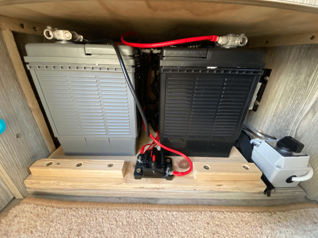 I’ve wired up the new lead acid batteries and fitted a 50A DC circuit breaker, and fused each lower rated supply individually running from this. I mounted the batteries on a board, strapped them to this for security, and added two small handles so I can pull the batteries out should I need to work on something. The board is also screwed in place for security.