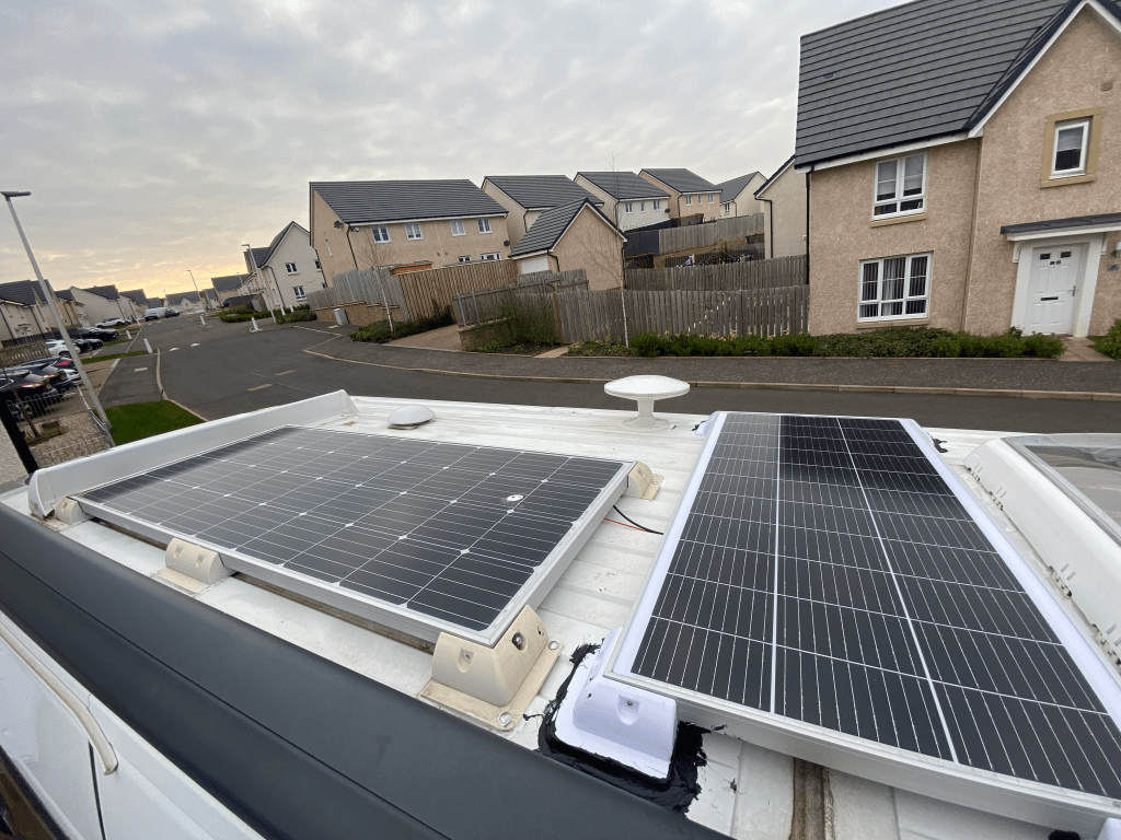 The 250W solar capacity should help charge the twin 110Ah batteries I added recently. The next job is to wire these up. Then remove the original single leisure battery – and fit this to the Caddy conversion we are working on for Duncan.