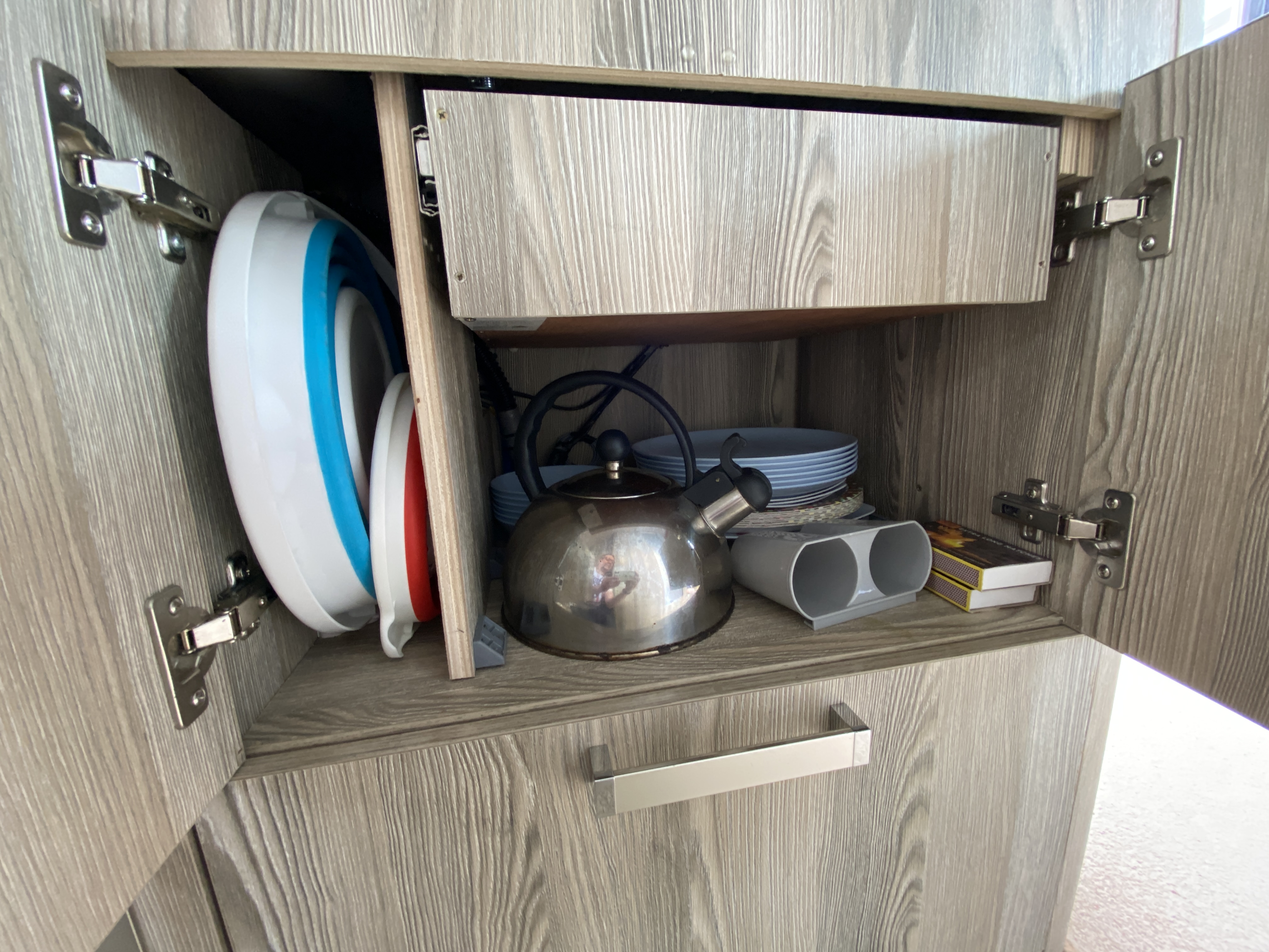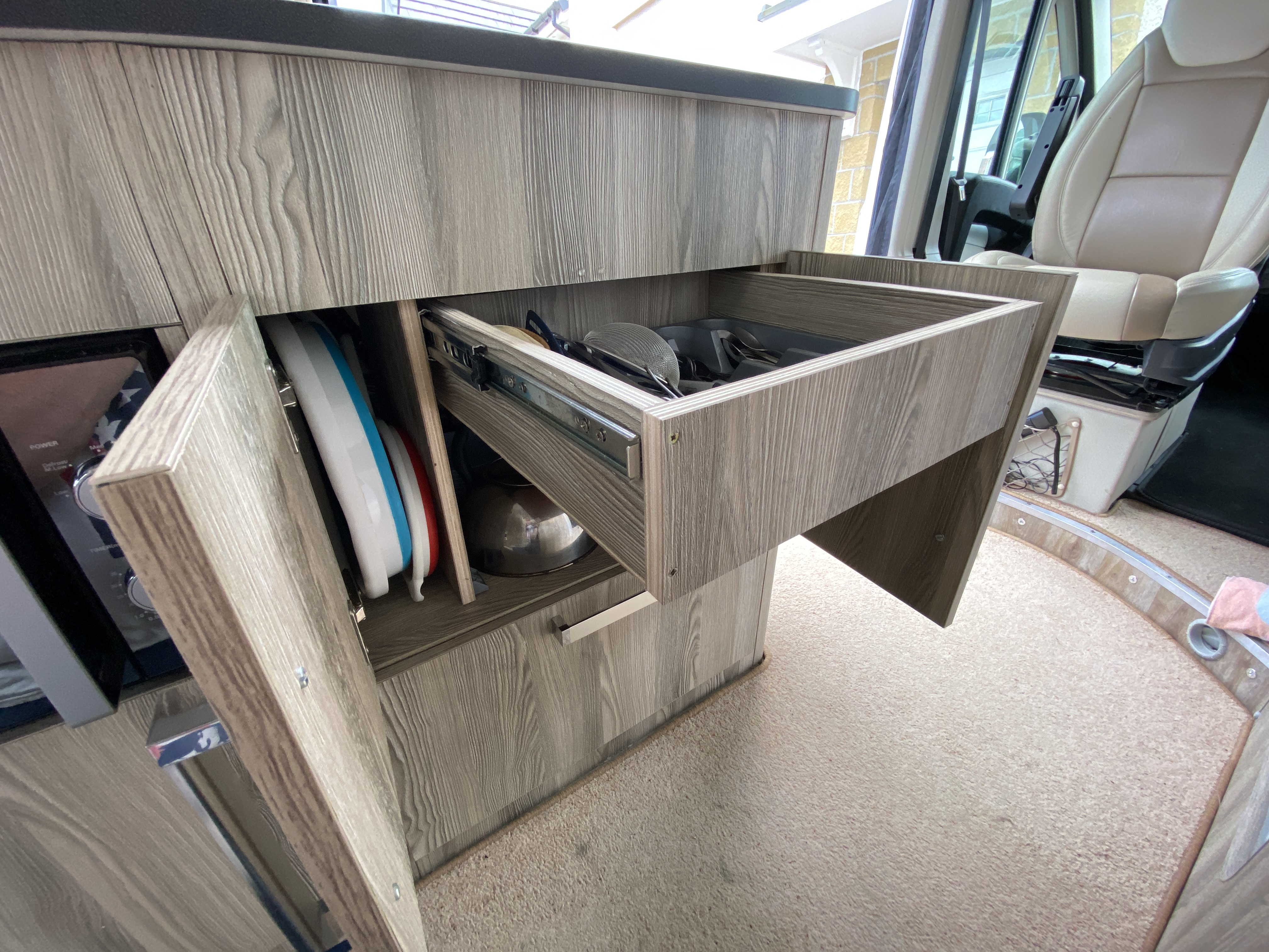We bought our campervan from someone who had converted it and we have been upgrading and modifying quite a few things as we go. There is one large open cupboard below the cooker which does not work well for us so we changed this building a cutlery drawer and a cupboard divider.
